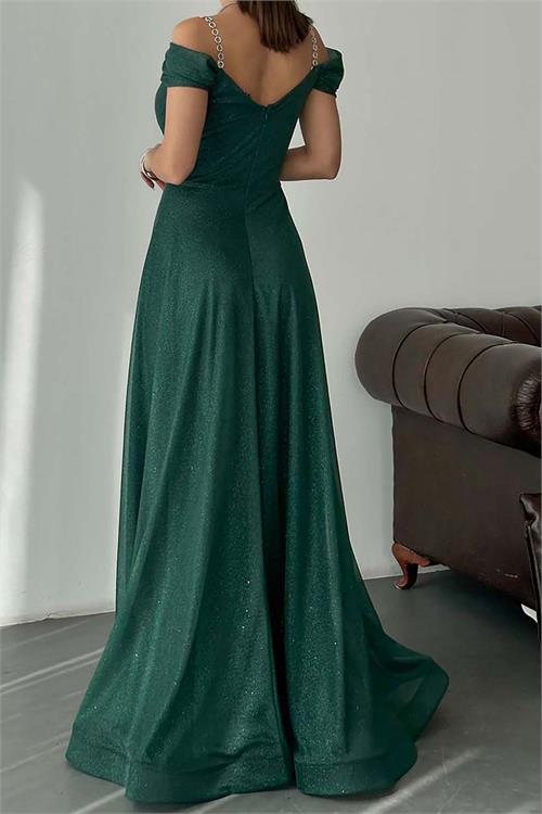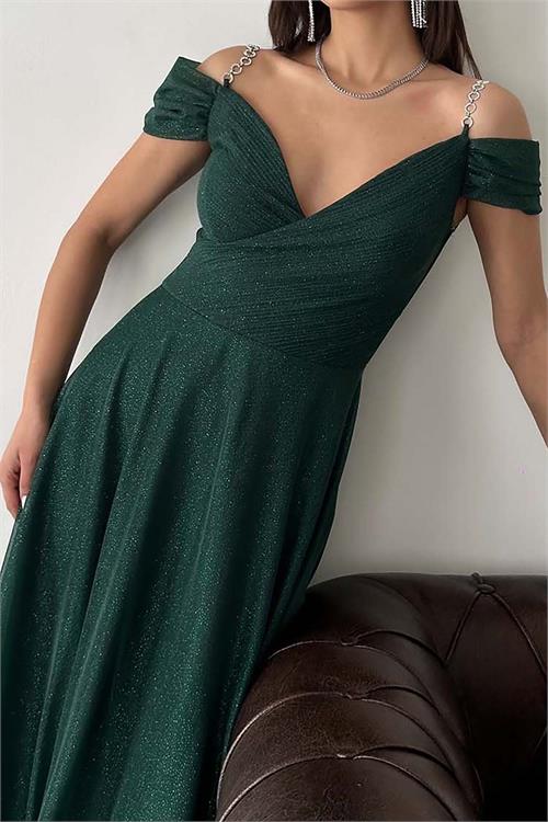Kadın Zümrüt Yeşili Işıltılı Omuz Detaylı Büyük Beden Abiye Elbise ESR068