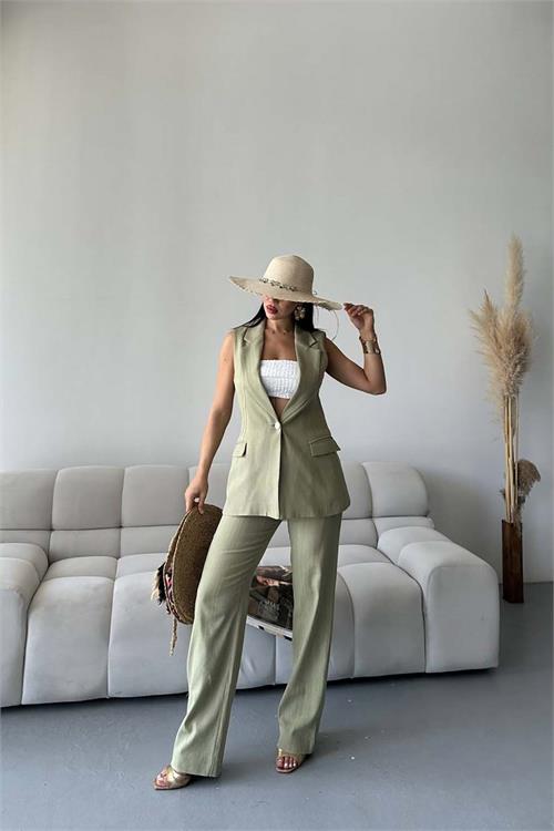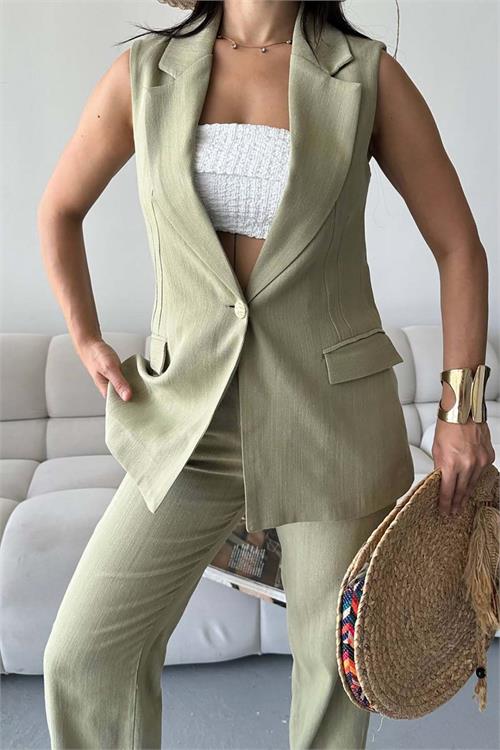 Yelek formundaki üst parçası ile klasik şıklığı yansıtırken, pantolonun rahat kesimi gün boyu konfor sağlar. Hafif ve nefes alabilen keten kumaşı sayesinde özellikle sıcak havalarda ideal bir tercihtir.