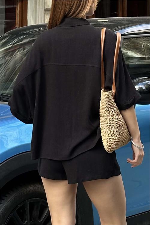 Kadın Siyah Keten Salaş Gömlek Şort Takım ESR037