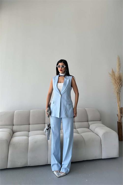 Kadın Mavi Keten Kumaş Yelek Pantolon Takım ESR086