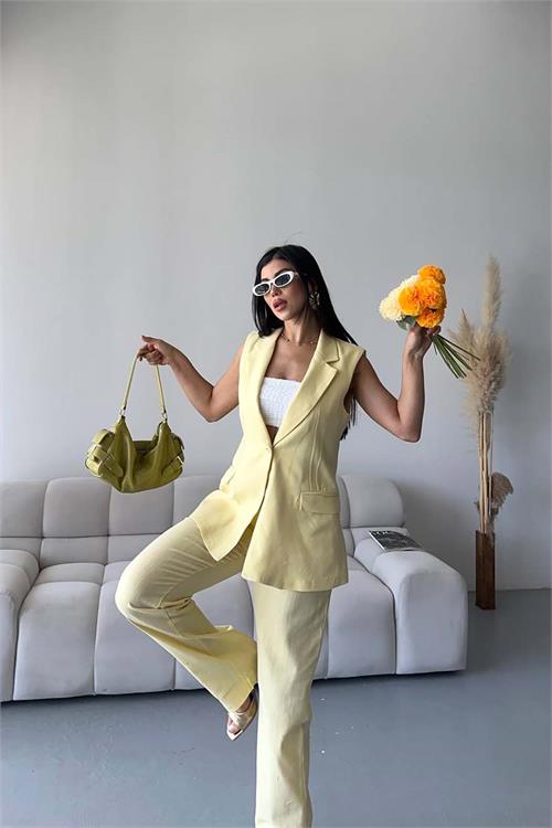 Kadın Sarı Keten Kumaş Yelek Pantolon Takım ESR086