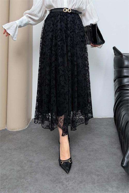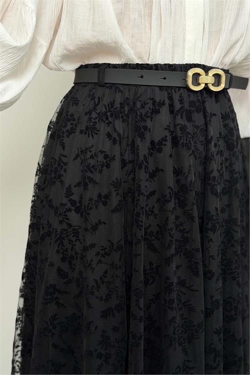 Astarlı yapısı sayesinde konforlu bir kullanım sağlarken, tül kumaşın hafif dokusu hareketli ve akışkan bir duruş kazandırır. Kemer detayı ile bel vurgusu yaparak daha estetik bir siluet oluşturur.