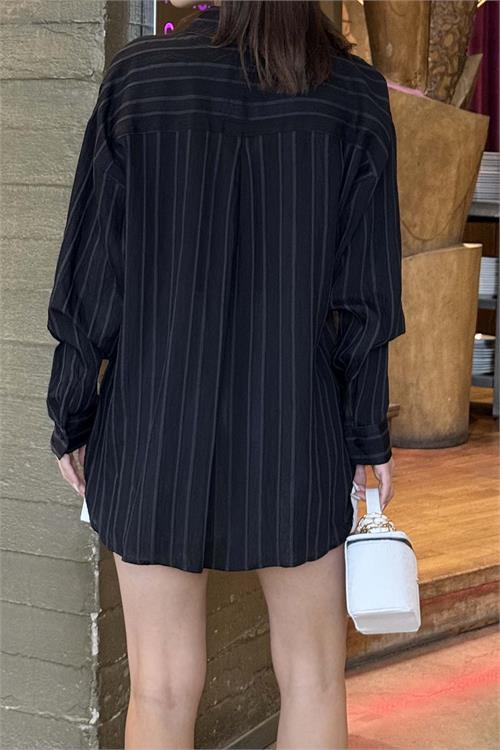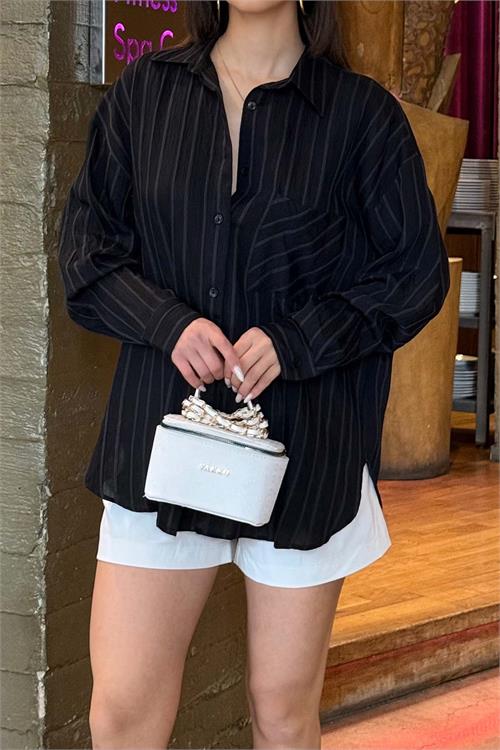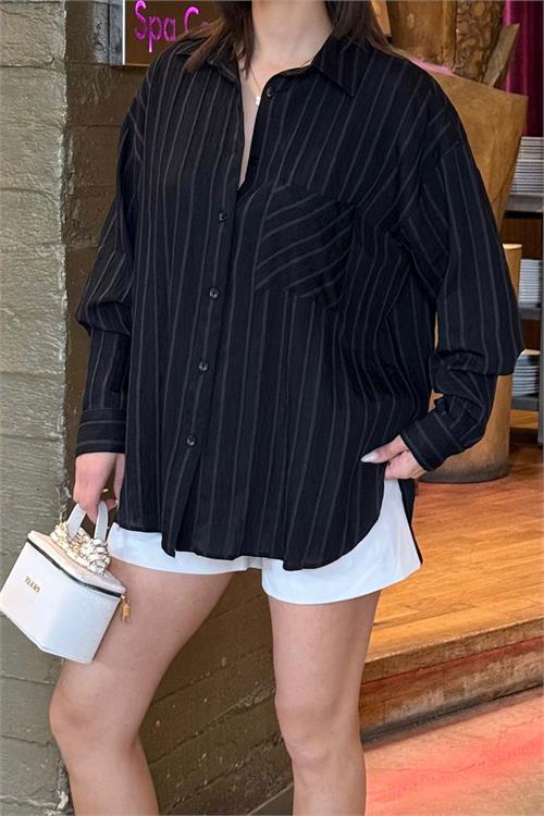 Kadın Siyah Çizgili Oversize Gömlek – Günlük Şık Kombin ESR079