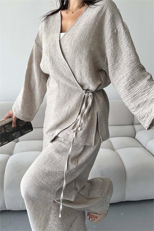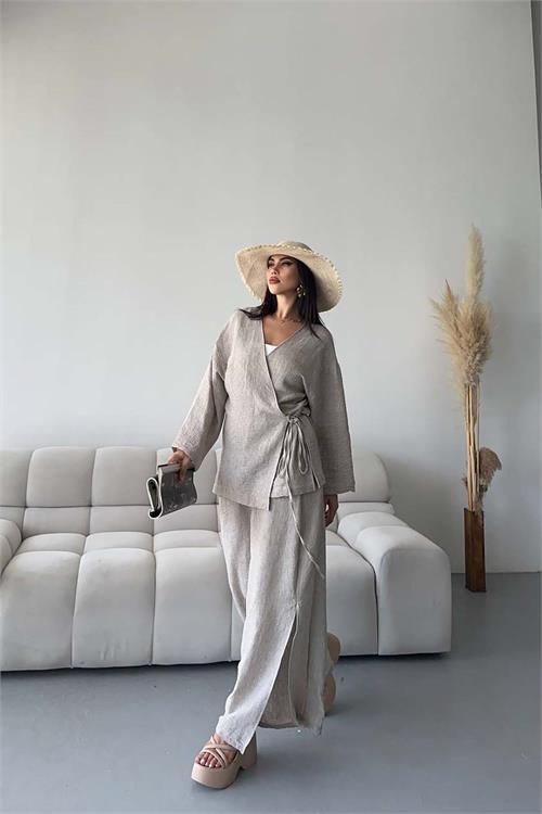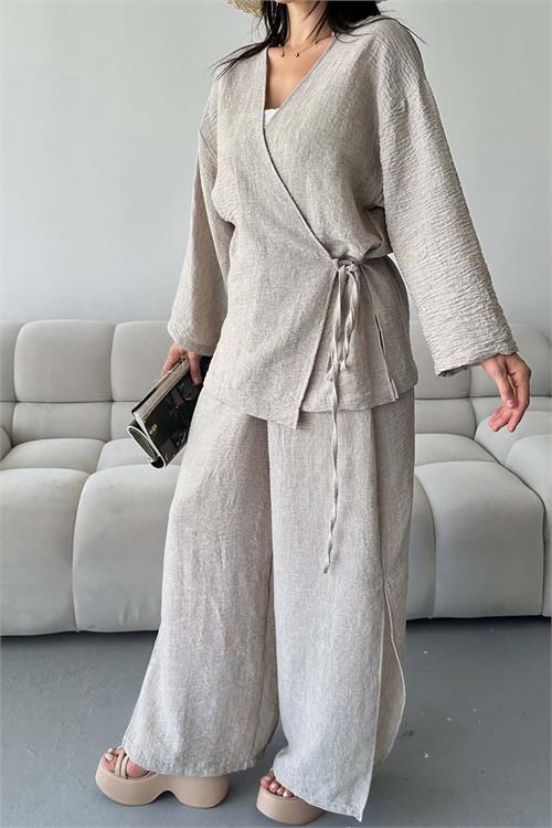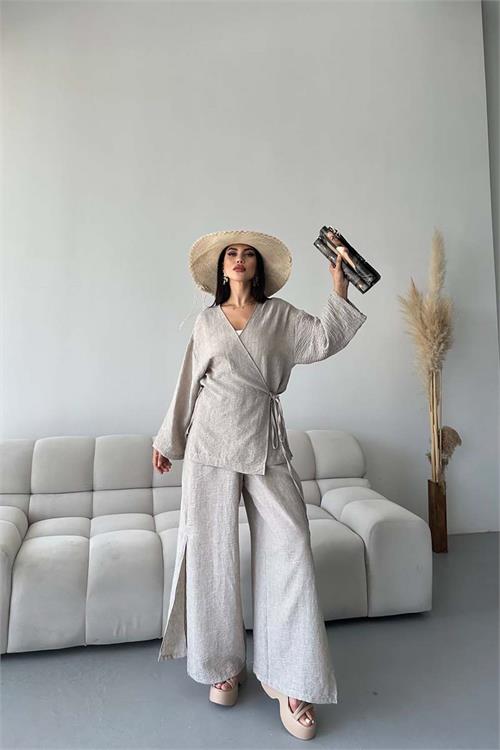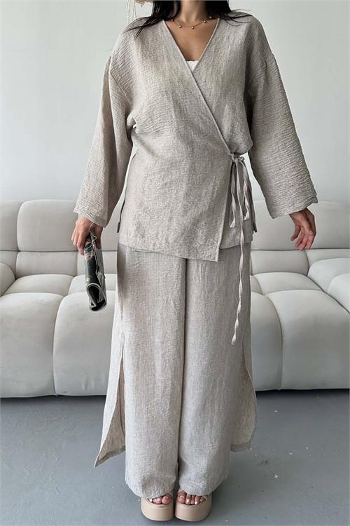 Kadın Bej Keten Kumaş Yan Bağlamalı Takım ESR087