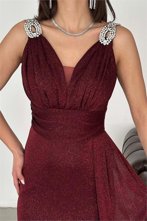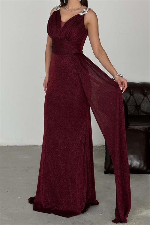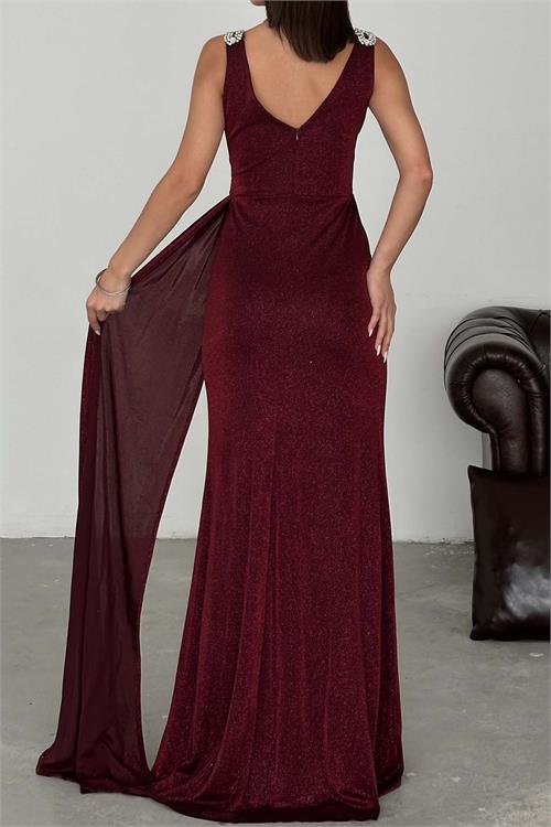 Işıltılı simli kumaşıyla dikkat çeken bu özel tasarım abiye elbise, zarif duruşu ve güçlü siluetiyle ön plana çıkar. V yaka formu ve omuzdaki taş detayları elbiseye şık bir dokunuş katarken, kuyruk detayı hareketli ve etkileyici bir görünüm sağlar. Büyük beden uyumuna özel tasarlanan kesimi sayesinde vücudu toparlar ve konforlu kullanım sunar.