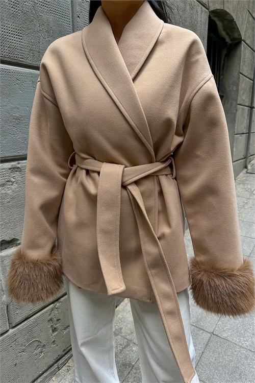 Camel kürk detaylı kaban, zarif duruşu ve modern kesimiyle günlük ve şehir kombinlerine şıklık kazandırır. Kruvaze yaka tasarımı klasik bir görünüm sunarken, kol uçlarındaki yumuşak kürk detaylar modele sofistike bir hava katar. Astarlı yapısı konforlu kullanım sağlarken, kuşaklı tasarımı bel hattını isteğe göre şekillendirme imkânı sunar. Rahat ve geniş kalıba sahip olan model, daha toparlayıcı bir duruş isteyenler için bir beden küçük tercih edilebilir. Günlük kullanımdan özel kombinlere kadar geniş bir kullanım alanına sahiptir.