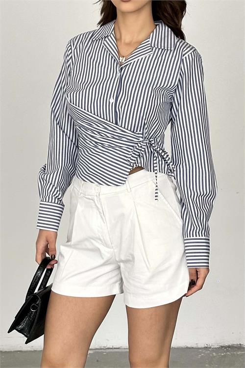 Kadın Çizgili Bağlama Detaylı Kruvaze Gömlek ESR062
