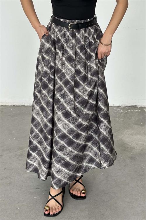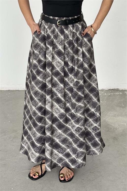 Modern desen yapısı ve akışkan formuyla öne çıkan uzun etek modeli, tesettür kombinler için hem şık hem konforlu bir alternatif sunar. Bel kısmında yer alan kemer detayı sayesinde vücut formunu zarif şekilde vurgular. Dökümlü yapısı ile hareketli ve estetik bir görünüm sağlarken, gün boyu rahat kullanım sunar. Günlük stilinizden özel kombinlerinize kadar geniş kullanım alanına sahiptir.