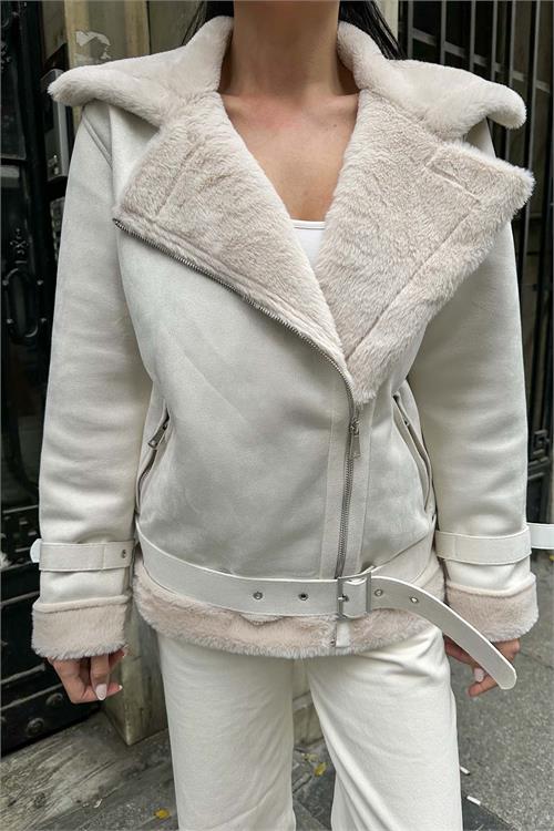Ekru kürk detaylı ceket, iç yüzeyinde kullanılan tavşan tüyü astarı sayesinde son derece yumuşak bir dokuya sahiptir ve serin havalarda sıcak tutan konforlu bir kullanım sunar. Kürk detaylı yakası ve manşetleri modele zarif bir görünüm kazandırırken, kuşaklı tasarımı bel hattını isteğe göre ayarlama imkânı sağlar. Astarlı yapısı ile gün boyu konfor sunan bu ceket, hem günlük kombinlerde hem de şık şehir stilinde rahatlıkla tercih edilebilir.