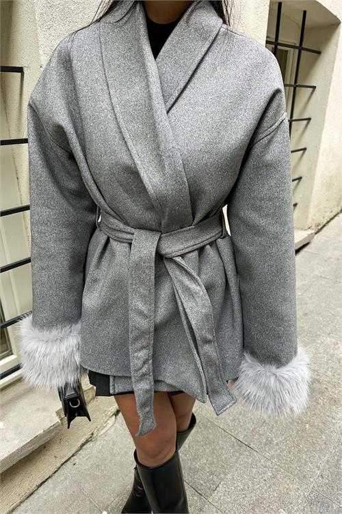 Gri kürk detaylı kaban, zarif duruşu ve modern kesimiyle günlük ve şehir kombinlerine şıklık kazandırır. Kruvaze yaka tasarımı klasik bir görünüm sunarken, kol uçlarındaki yumuşak kürk detaylar modele sofistike bir hava katar. Astarlı yapısı konforlu kullanım sağlarken, kuşaklı tasarımı bel hattını isteğe göre şekillendirme imkânı sunar. Rahat ve geniş kalıba sahip olan model, daha toparlayıcı bir duruş isteyenler için bir beden küçük tercih edilebilir. Günlük kullanımdan özel kombinlere kadar geniş bir kullanım alanına sahiptir.