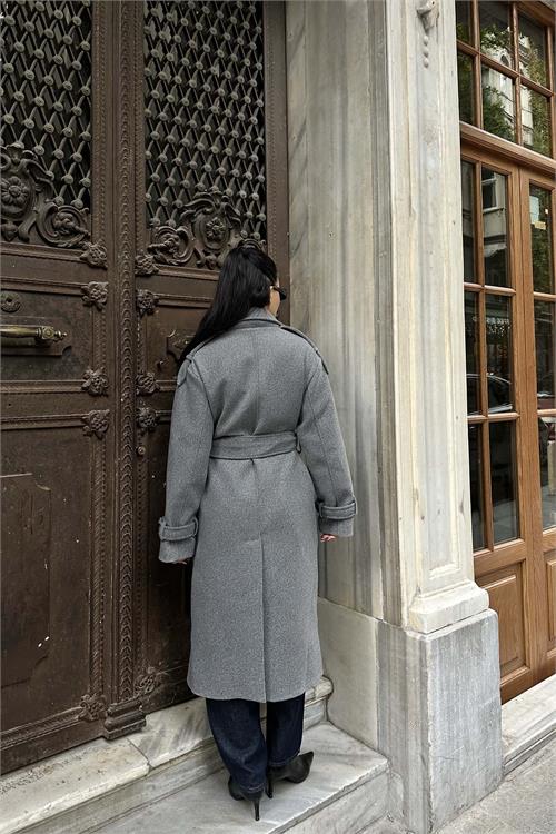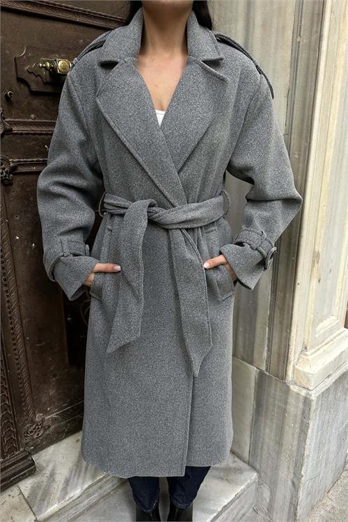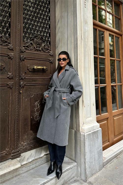 Kadın Gri Kuşaklı Rahat Kalıp Astarlı Kaban | Şık Model ESR002