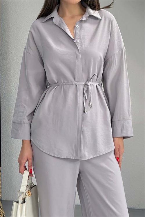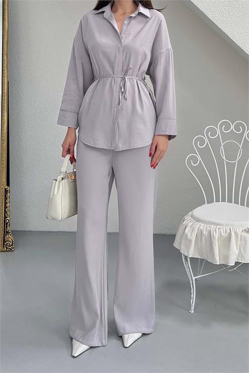 Kadın Gri Modal Gömlek Yaka Büzgü Detaylı Pantolon Takım ESR045