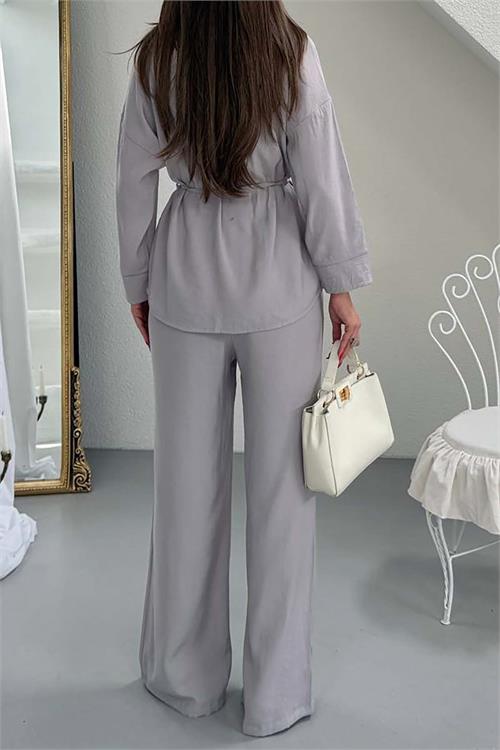 Düğmeli gömlek tasarımı ve bel kısmındaki bağlama detayı takıma zarif bir siluet kazandırırken, rahat kesimli pantolon günlük kombinlerde şık ve dengeli bir görünüm oluşturur. Minimal ve zamansız tasarımı sayesinde hem günlük kullanımda hem de şehir stilinde kolayca kombinlenebilir.