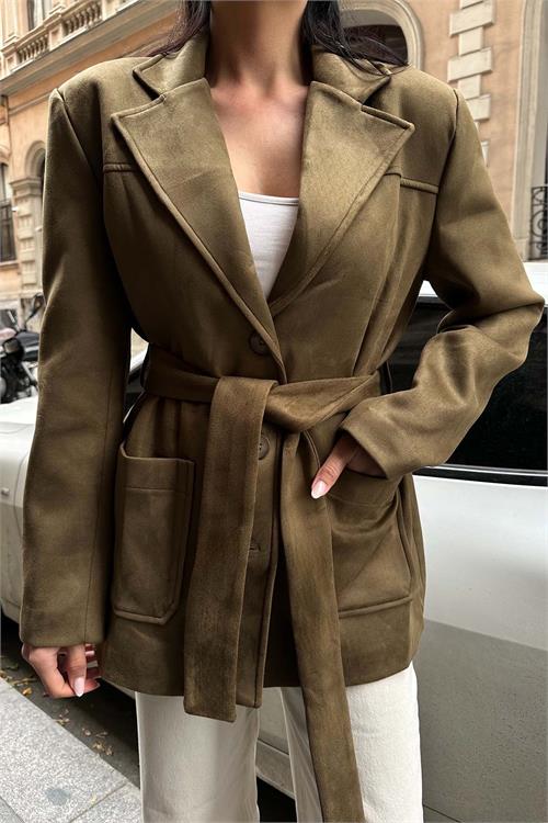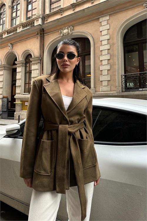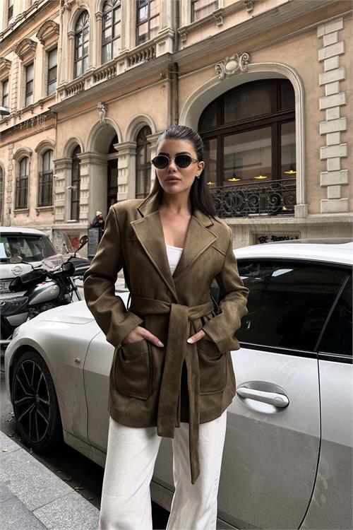 Şık ve modern duruşu ile öne çıkan bu süet ceket, zamansız tasarımı sayesinde hem günlük hem de şehir stilinde rahatlıkla kullanılabilir. Yumuşak süet dokusu ve kemerli tasarımı ile vücut formunu dengeli şekilde tamamlayan güçlü bir siluet sunar.