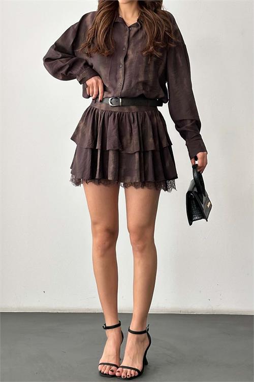 Modern ve güçlü bir stil sunan bu ikili takım, gömlek yaka tasarımı ve kat kat etek detayıyla dikkat çeker. Rahat kalıbı sayesinde gün boyu konfor sunarken, hareketli yapısıyla feminen ve iddialı bir görünüm kazandırır. Hem günlük şık kombinlerde hem de özel davetlerde rahatlıkla tercih edilebilecek zamansız bir parçadır.