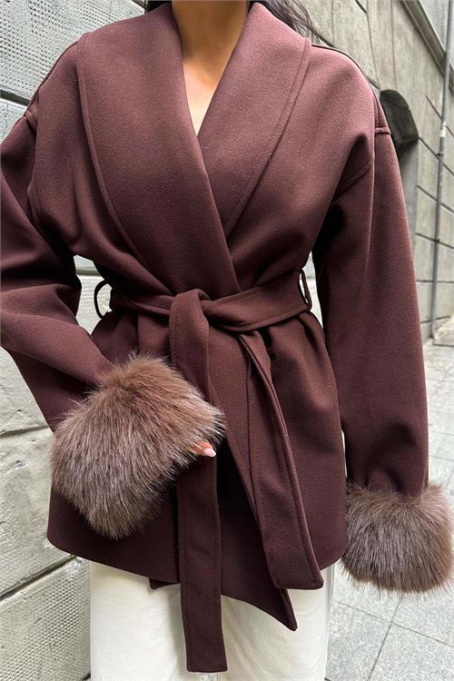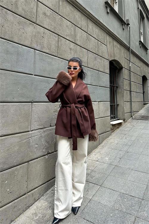 Kahverengi kürk detaylı kaban, zarif duruşu ve modern kesimiyle günlük ve şehir kombinlerine şıklık kazandırır. Kruvaze yaka tasarımı klasik bir görünüm sunarken, kol uçlarındaki yumuşak kürk detaylar modele sofistike bir hava katar. Astarlı yapısı konforlu kullanım sağlarken, kuşaklı tasarımı bel hattını isteğe göre şekillendirme imkânı sunar. Rahat ve geniş kalıba sahip olan model, daha toparlayıcı bir duruş isteyenler için bir beden küçük tercih edilebilir. Günlük kullanımdan özel kombinlere kadar geniş bir kullanım alanına sahiptir.