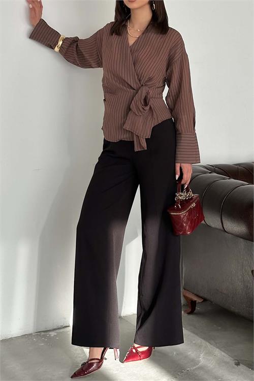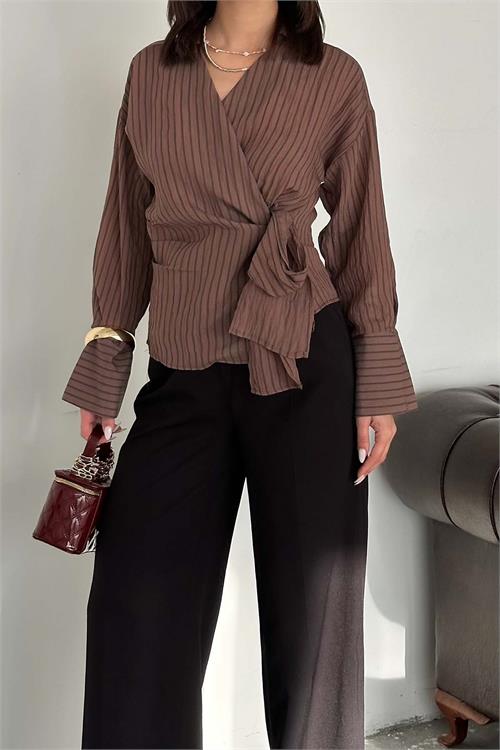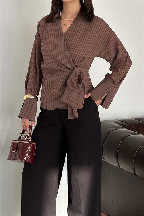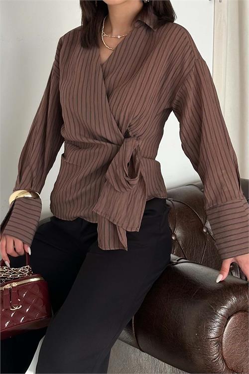 Kadın Kahvrengi Çizgili Kruvaze Bağlama Detaylı Gömlek ESR064