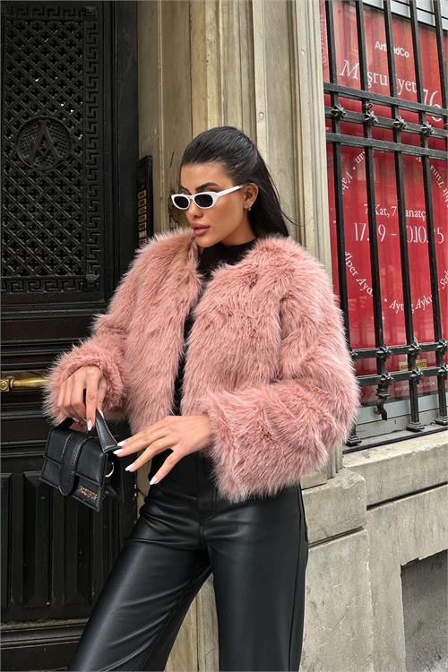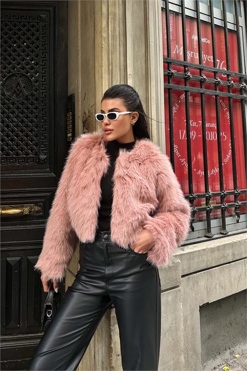 Pembe kısa kürk mont yumuşak dokulu yapısı ve modern duruşu ile öne çıkar Astarlı yapısı sayesinde soğuk havalarda konforlu kullanım sunar Önü açık tasarımı katmanlı kombinler için idealdir Kısa boy kesimi pantolon etek ve elbiselerle kolay kombinlenir Günlük şehir stilinden şık kombinlere kadar geniş kullanım alanı sağlar