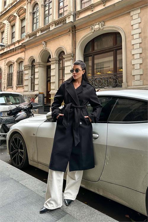 Kadın Siyah Kuşaklı Rahat Kalıp Astarlı Kaban | Şık Model ESR002