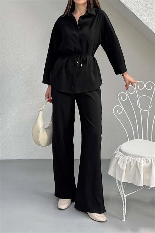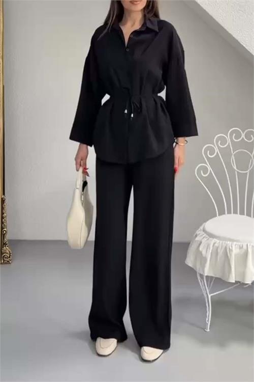 Düğmeli gömlek tasarımı ve bel kısmındaki bağlama detayı takıma zarif bir siluet kazandırırken, rahat kesimli pantolon günlük kombinlerde şık ve dengeli bir görünüm oluşturur. Minimal ve zamansız tasarımı sayesinde hem günlük kullanımda hem de şehir stilinde kolayca kombinlenebilir.