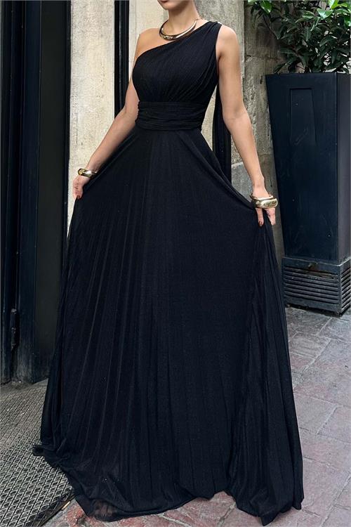 Drapeli üst formu ve piliseli, akışkan eteğiyle gecenin yıldızı olmaya hazır.