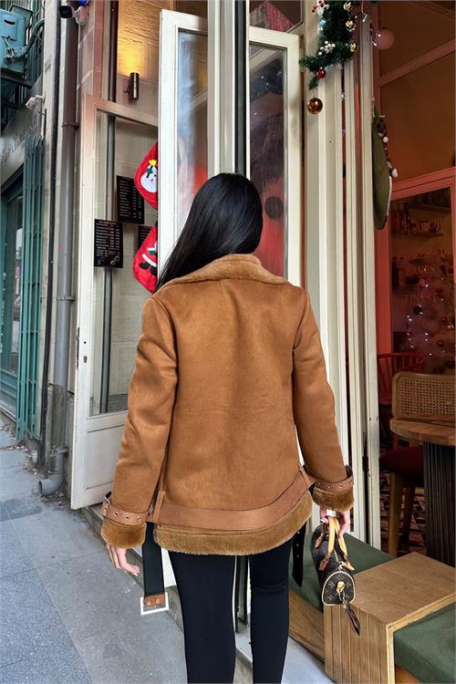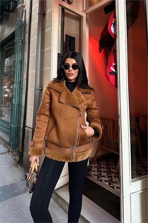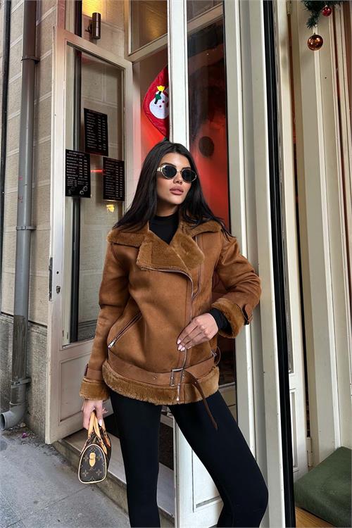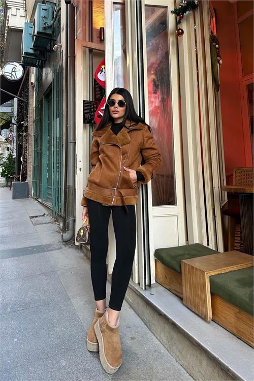 Taba kürk detaylı ceket, iç yüzeyinde kullanılan tavşan tüyü astarı sayesinde son derece yumuşak bir dokuya sahiptir ve serin havalarda sıcak tutan konforlu bir kullanım sunar. Kürk detaylı yakası ve manşetleri modele zarif bir görünüm kazandırırken, kuşaklı tasarımı bel hattını isteğe göre ayarlama imkânı sağlar. Astarlı yapısı ile gün boyu konfor sunan bu ceket, hem günlük kombinlerde hem de şık şehir stilinde rahatlıkla tercih edilebilir.