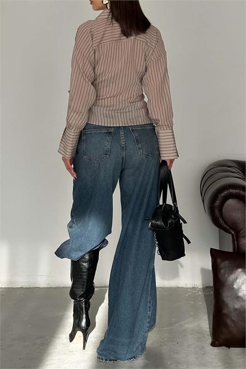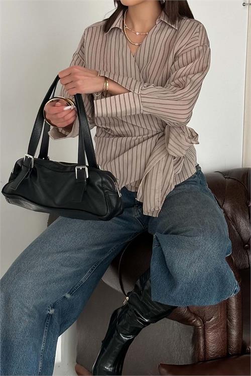 Modern çizgili deseni ve şık kruvaze formuyla öne çıkan gömlek modeli, bağlama detayı sayesinde vücuda uyum sağlayarak feminen ve dengeli bir siluet oluşturur. Hafif ve akışkan yapısı gün boyu konfor sunarken, hem günlük kombinlerde hem de daha şık stillerde rahatlıkla kullanılabilir. Vizon tonunun sıcak ve sofistike duruşu, kombinlerinize güçlü bir karakter katar.