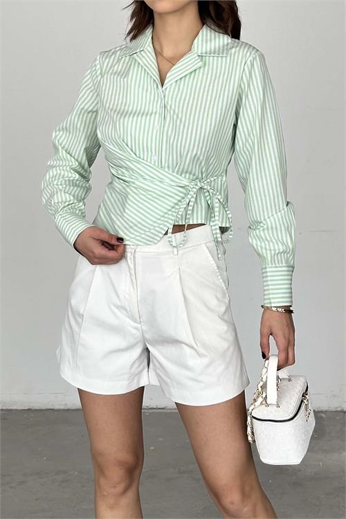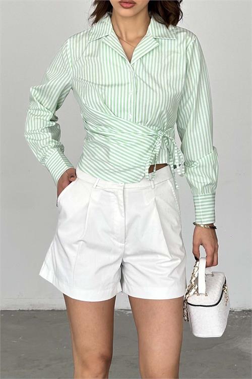 Çizgili deseni ve modern kesimiyle dikkat çeken gömlek modeli, kruvaze bağlama detayıyla klasik formun dışına çıkarak farklı bir stil sunar. Bel kısmındaki bağlama detayı sayesinde vücuda uyum sağlar ve daha fit bir görünüm oluşturur. Hafif yapısı ile gün boyu konfor sunarken, şık duruşuyla kombinlerinize güçlü bir hava katar.