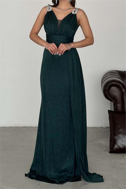 Kadın Zümrüt Yeşili Simli Kumaş Büyük Beden Abiye Elbise ESR073