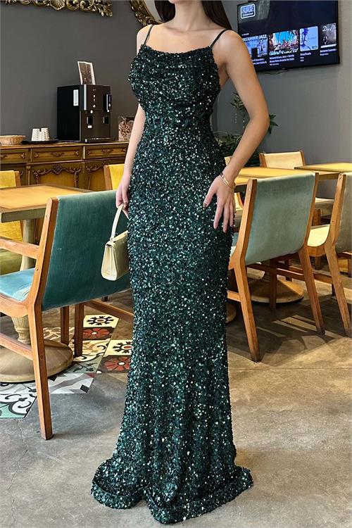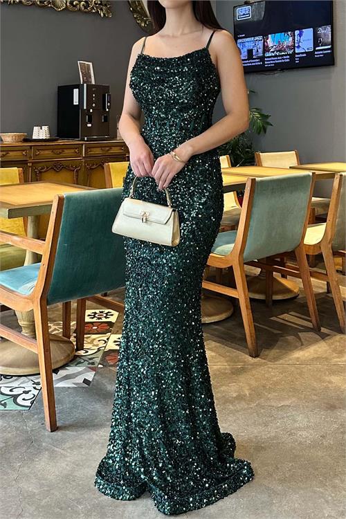 Zümrüt Yeşili Pul Payetli Uzun Abiye Elbise | Astarlı Şık Gece Elbisesi ESR033