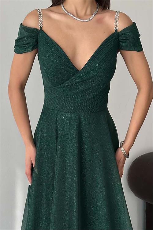 Kadın Zümrüt Yeşili Işıltılı Omuz Detaylı Büyük Beden Abiye Elbise ESR068