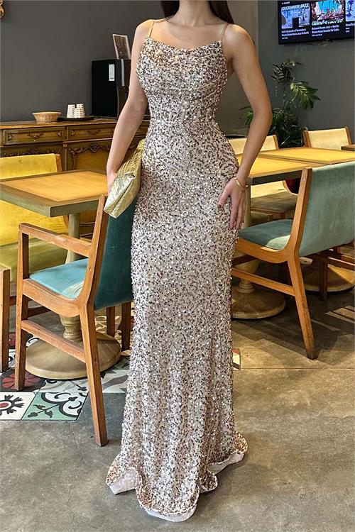 Yoğun pul payet dokusu ile ışığı kusursuz şekilde yansıtan bu uzun abiye elbise, özel gecelerde tüm dikkatleri üzerine çeker.