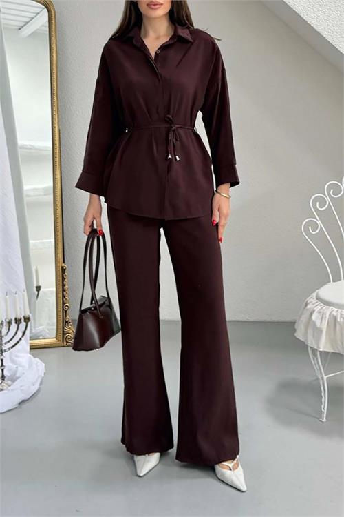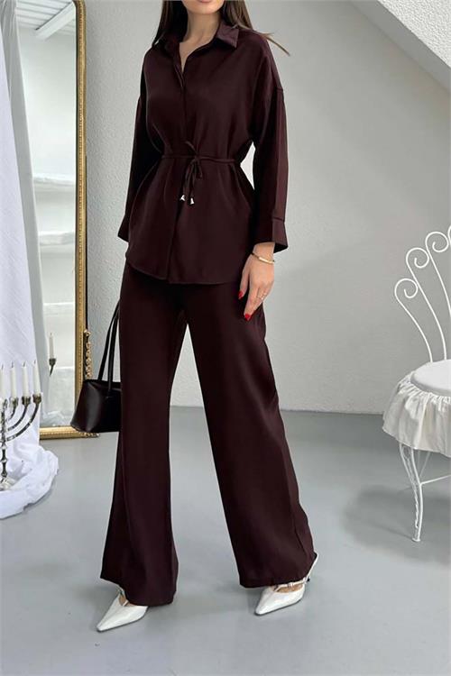 Düğmeli gömlek tasarımı ve bel kısmındaki bağlama detayı takıma zarif bir siluet kazandırırken, rahat kesimli pantolon günlük kombinlerde şık ve dengeli bir görünüm oluşturur. Minimal ve zamansız tasarımı sayesinde hem günlük kullanımda hem de şehir stilinde kolayca kombinlenebilir.
