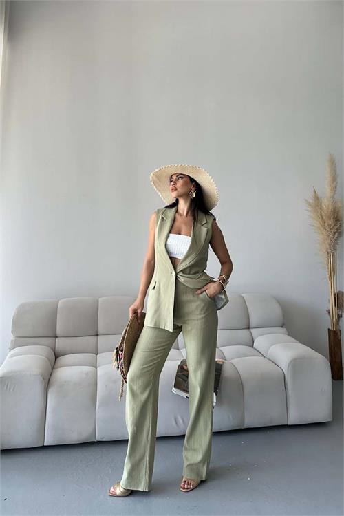 Yelek formundaki üst parçası ile klasik şıklığı yansıtırken, pantolonun rahat kesimi gün boyu konfor sağlar. Hafif ve nefes alabilen keten kumaşı sayesinde özellikle sıcak havalarda ideal bir tercihtir.