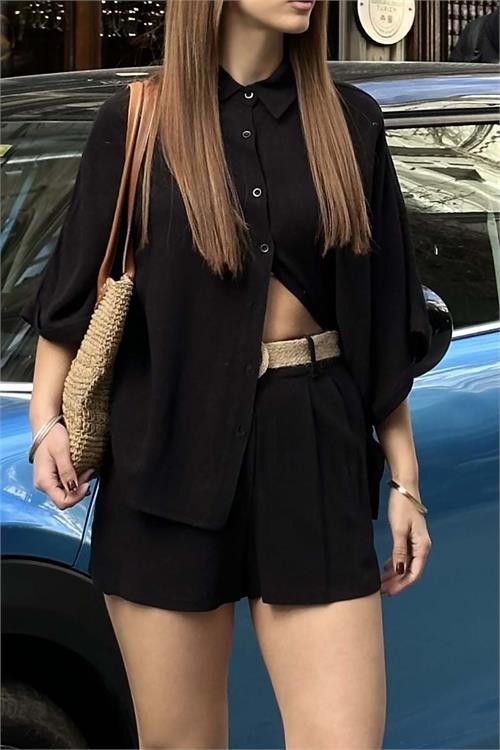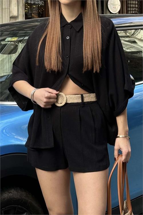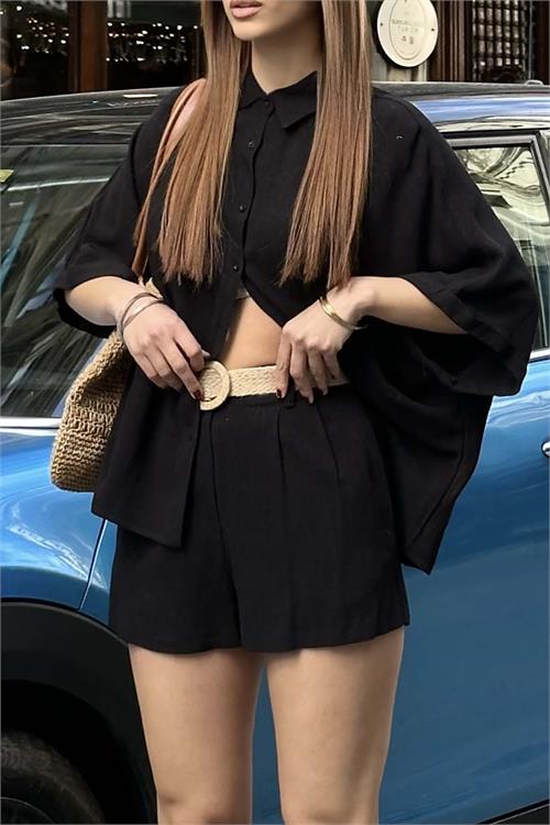 Kadın Siyah Keten Salaş Gömlek Şort Takım ESR037