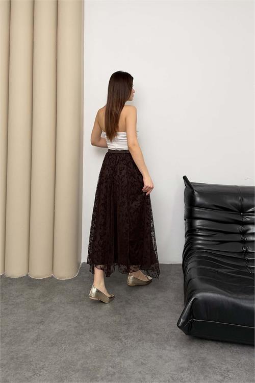 Kadın Kahverengi Astarlı Tüllü Midi Etek Kemerli Şık Tasarım ESR082