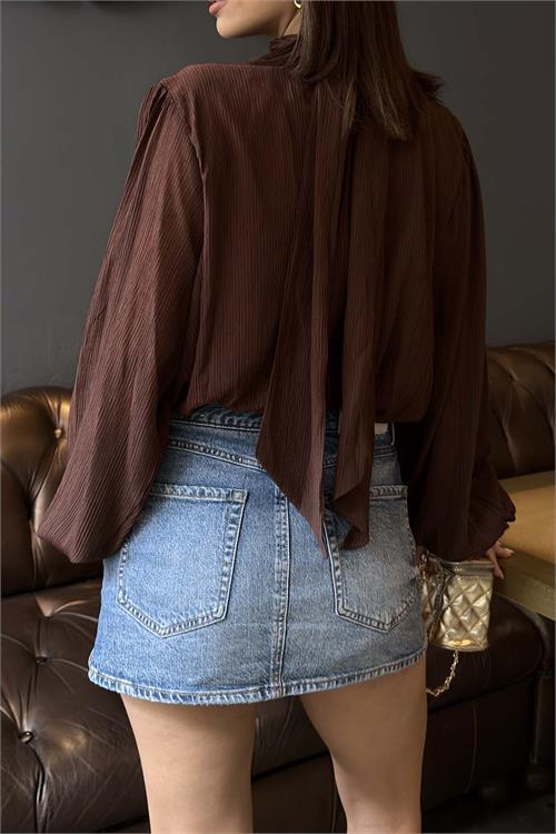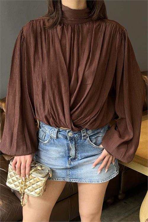 Kadın Kahverengi Drapeli Bluz Balıkçı Yaka Uzun Kollu ESR077