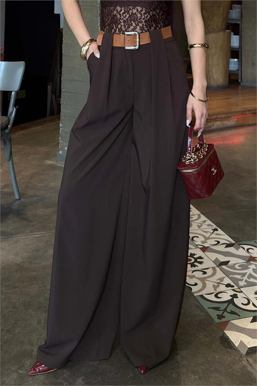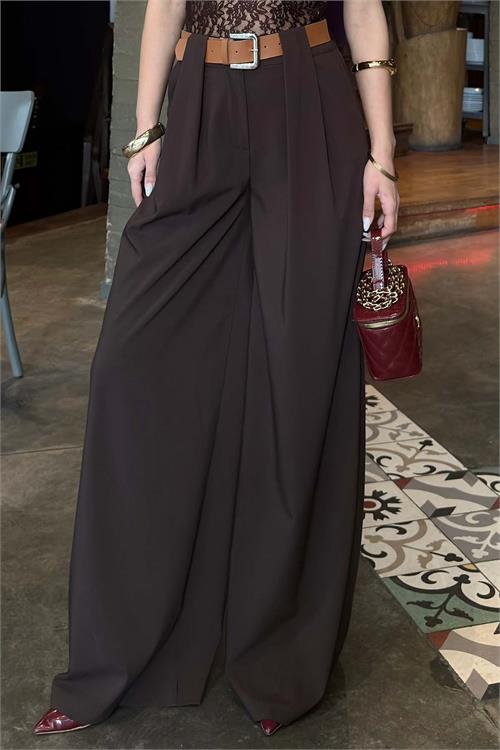 Kadın Kahverengi Kemerli Poliviskon Kumaş Bol Paça Pantolon – ESR080