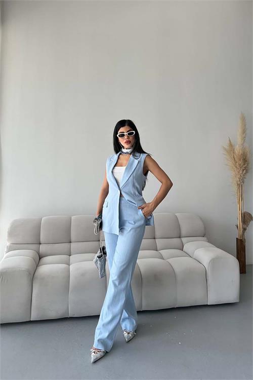 Kadın Mavi Keten Kumaş Yelek Pantolon Takım ESR086