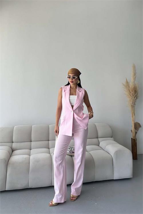 Kadın Pudra Keten Kumaş Yelek Pantolon Takım ESR086