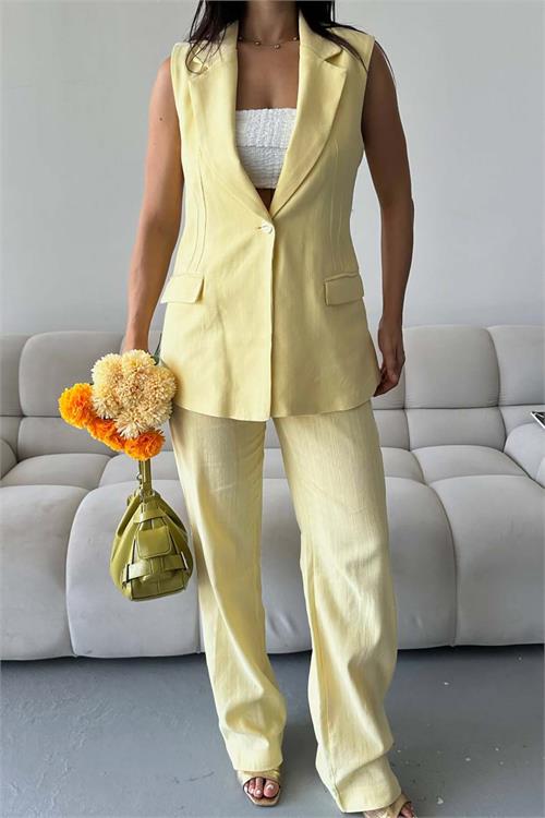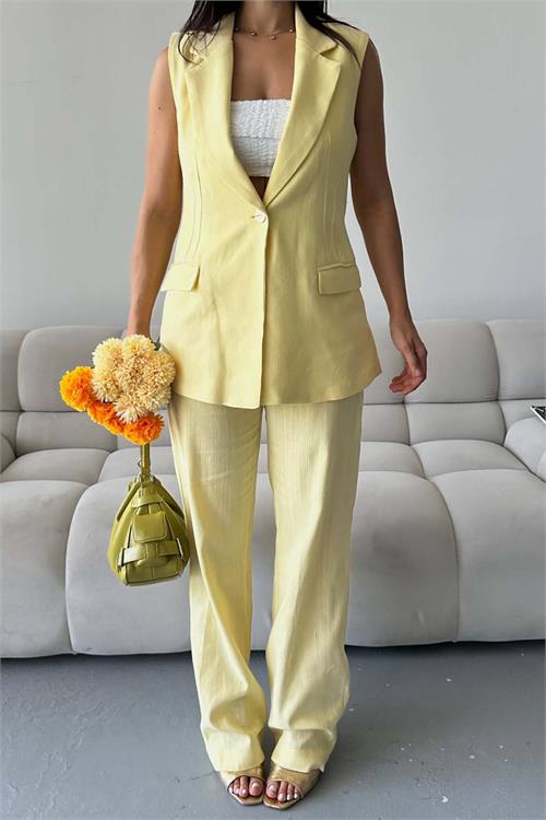 Kadın Sarı Keten Kumaş Yelek Pantolon Takım ESR086