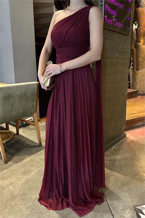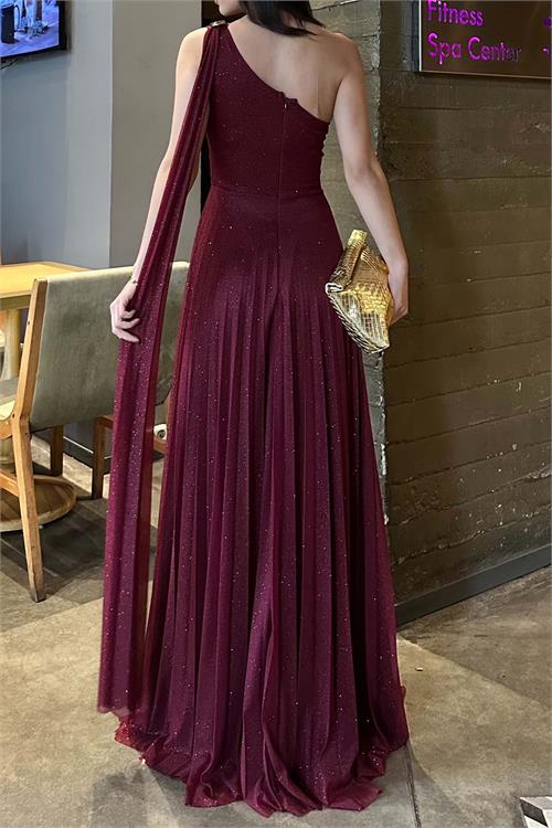 Kadın Bordo Tek Omuz Simli Kumaş Işıltılı Maxi Abiye Elbise ESR030