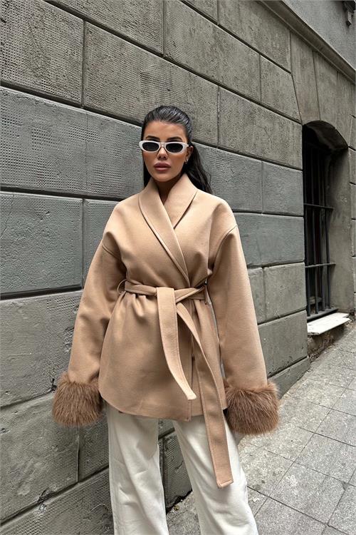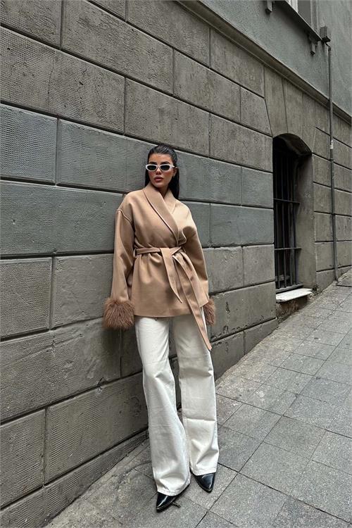 Camel kürk detaylı kaban, zarif duruşu ve modern kesimiyle günlük ve şehir kombinlerine şıklık kazandırır. Kruvaze yaka tasarımı klasik bir görünüm sunarken, kol uçlarındaki yumuşak kürk detaylar modele sofistike bir hava katar. Astarlı yapısı konforlu kullanım sağlarken, kuşaklı tasarımı bel hattını isteğe göre şekillendirme imkânı sunar. Rahat ve geniş kalıba sahip olan model, daha toparlayıcı bir duruş isteyenler için bir beden küçük tercih edilebilir. Günlük kullanımdan özel kombinlere kadar geniş bir kullanım alanına sahiptir.