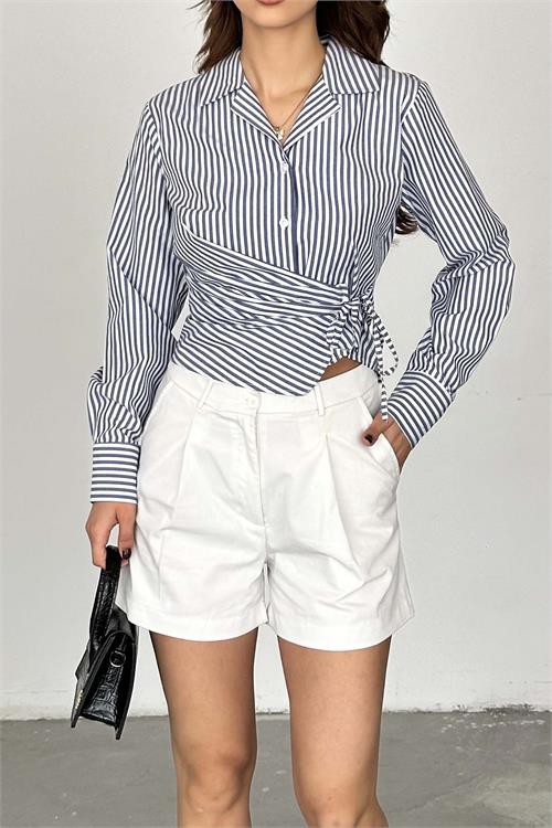 Kadın Çizgili Bağlama Detaylı Kruvaze Gömlek ESR062