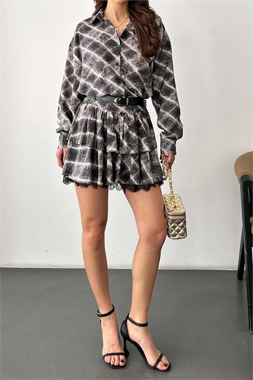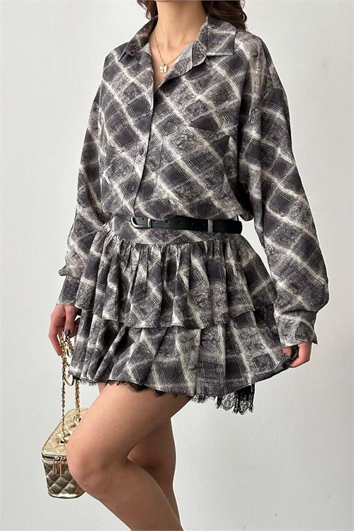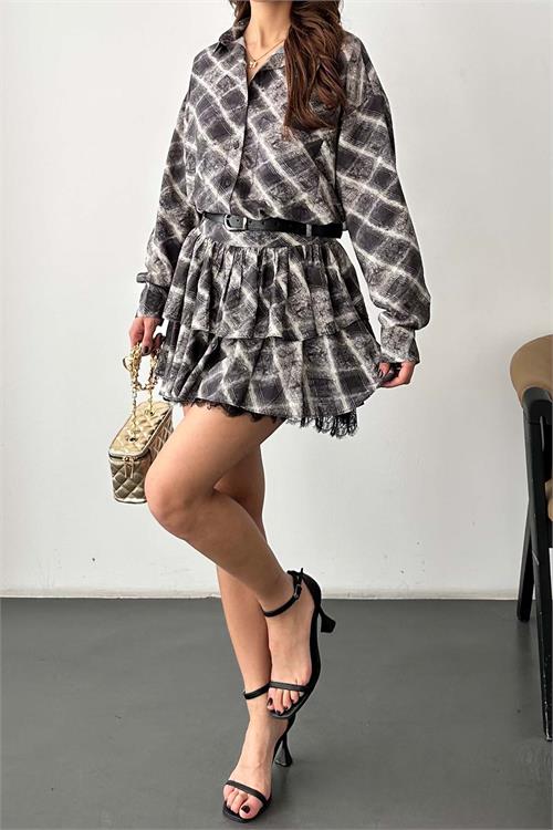 Kadın Ekose Gömlek Yaka Etek Takım – Kemer Dahil ESR049