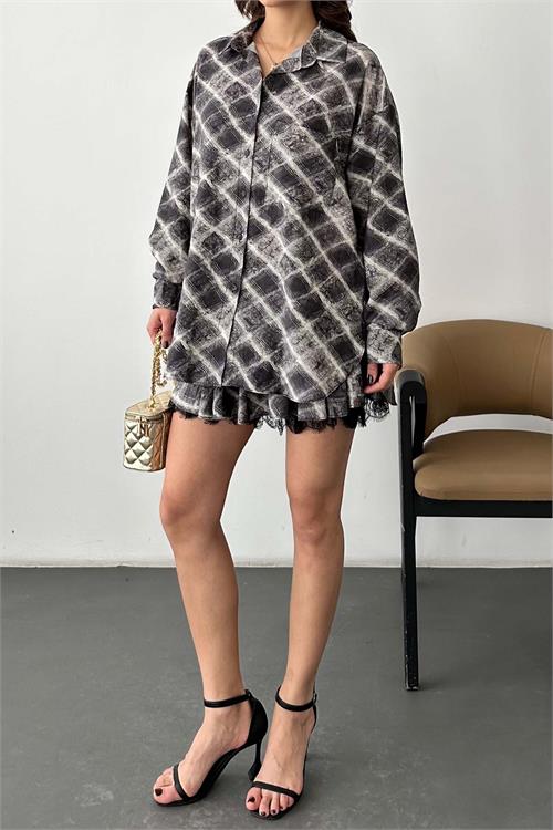 Modern ve şık bir stil sunan ekose desenli etek gömlek ikili takım, günlük şıklığı güçlü bir tasarımla buluşturur. Gömlek yaka üst tasarımı klasik bir görünüm sunarken, kat kat volanlı mini etek modeli feminen ve hareketli bir stil oluşturur.