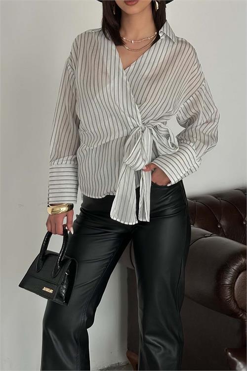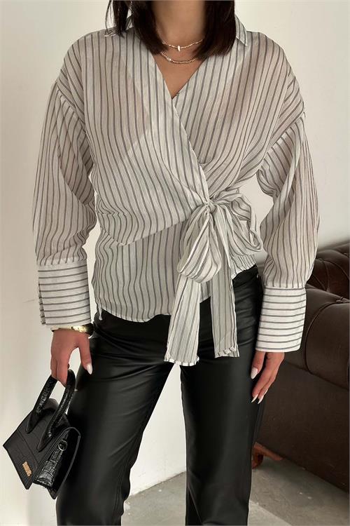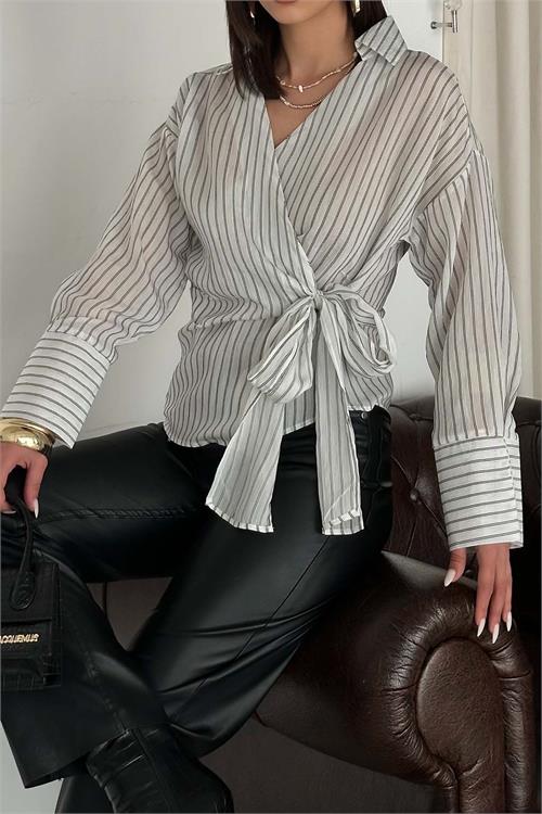 Kadın Ekru Çizgili Kruvaze Bağlama Detaylı Gömlek ESR064