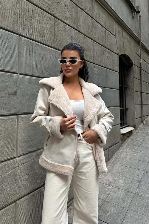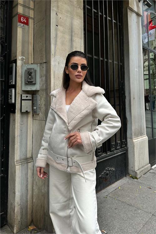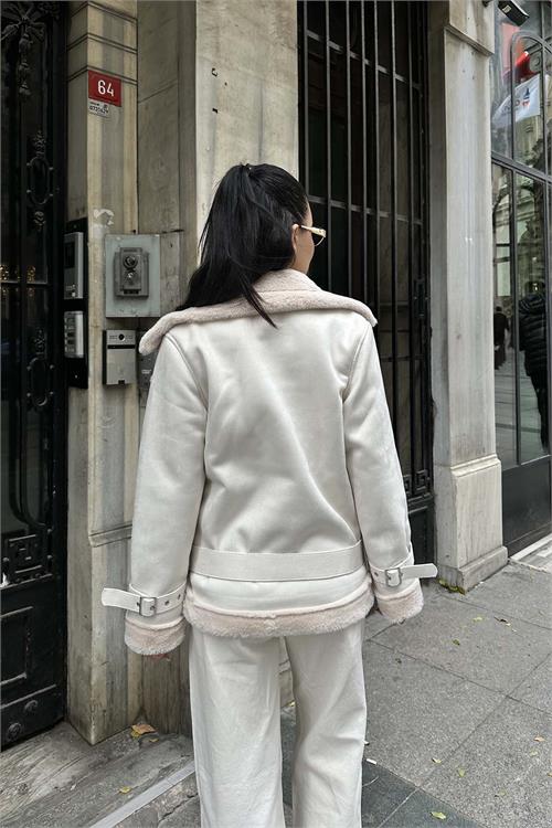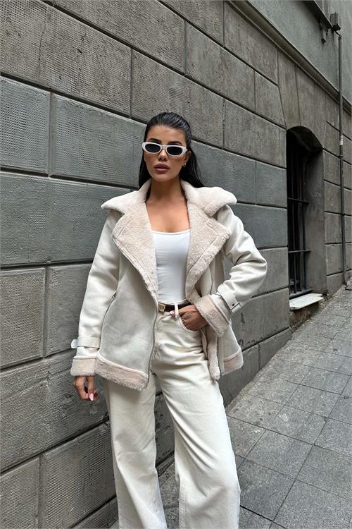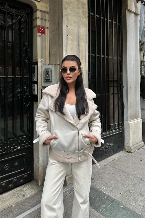 Ekru kürk detaylı ceket, iç yüzeyinde kullanılan tavşan tüyü astarı sayesinde son derece yumuşak bir dokuya sahiptir ve serin havalarda sıcak tutan konforlu bir kullanım sunar. Kürk detaylı yakası ve manşetleri modele zarif bir görünüm kazandırırken, kuşaklı tasarımı bel hattını isteğe göre ayarlama imkânı sağlar. Astarlı yapısı ile gün boyu konfor sunan bu ceket, hem günlük kombinlerde hem de şık şehir stilinde rahatlıkla tercih edilebilir.
