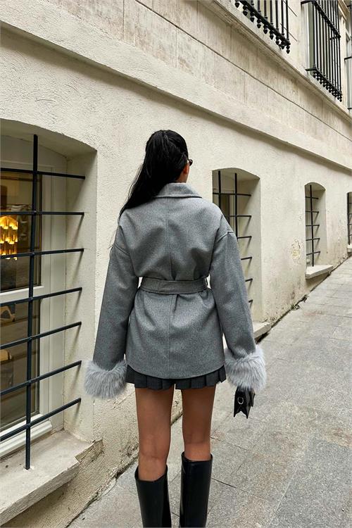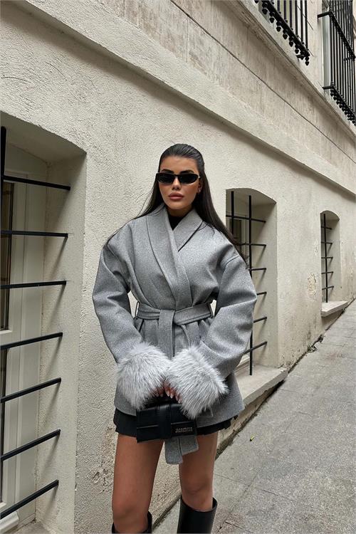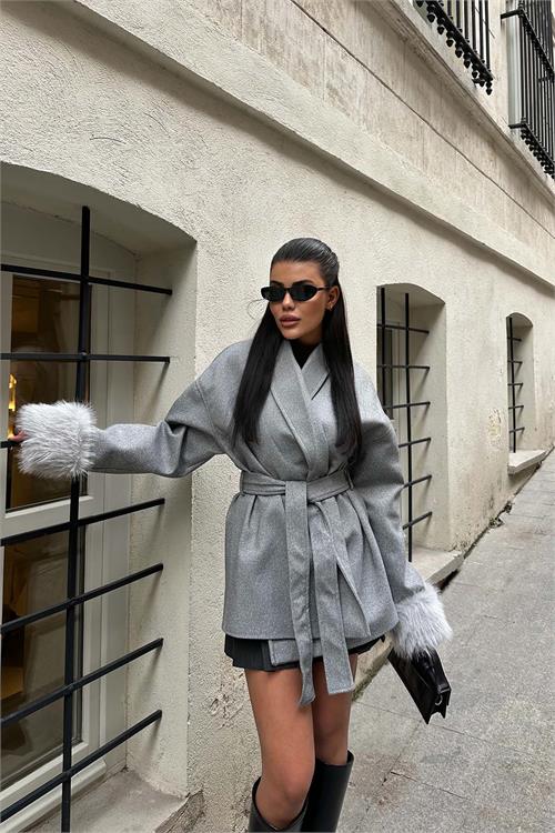 Gri kürk detaylı kaban, zarif duruşu ve modern kesimiyle günlük ve şehir kombinlerine şıklık kazandırır. Kruvaze yaka tasarımı klasik bir görünüm sunarken, kol uçlarındaki yumuşak kürk detaylar modele sofistike bir hava katar. Astarlı yapısı konforlu kullanım sağlarken, kuşaklı tasarımı bel hattını isteğe göre şekillendirme imkânı sunar. Rahat ve geniş kalıba sahip olan model, daha toparlayıcı bir duruş isteyenler için bir beden küçük tercih edilebilir. Günlük kullanımdan özel kombinlere kadar geniş bir kullanım alanına sahiptir.