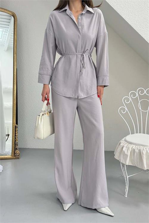Düğmeli gömlek tasarımı ve bel kısmındaki bağlama detayı takıma zarif bir siluet kazandırırken, rahat kesimli pantolon günlük kombinlerde şık ve dengeli bir görünüm oluşturur. Minimal ve zamansız tasarımı sayesinde hem günlük kullanımda hem de şehir stilinde kolayca kombinlenebilir.